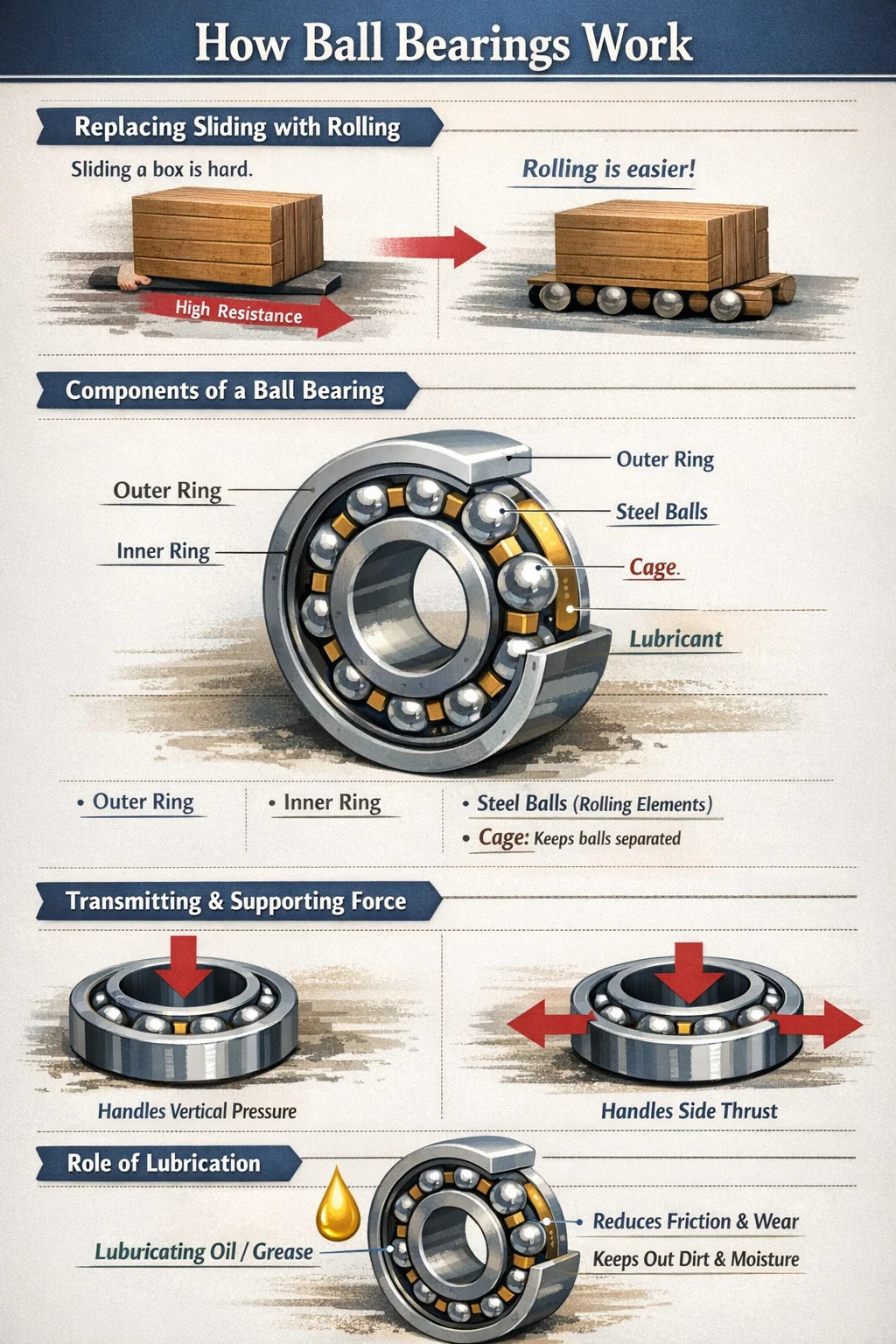 Kugellager funktionieren auf die gleiche Weise. Sie verwenden kleine, glatte Kugeln im Inneren, um die intensive „Reibung“ zwischen den Teilen in sanftes „Rollen“ umzuwandeln.